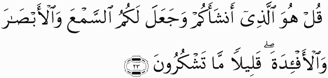Say, "It is He who has produced you and made for you hearing and vision and hearts; little are you grateful."