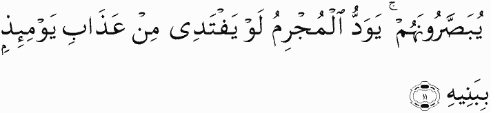 They will be shown each other. The criminal will wish that he could be ransomed from the punishment of that Day by his children
