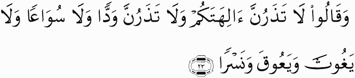 And said, 'Never leave your gods and never leave Wadd or Suwa' or Yaghuth and Ya'uq and Nasr.