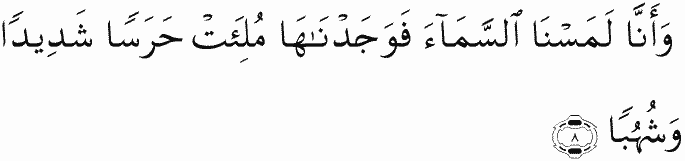 And we have sought [to reach] the heaven but found it filled with powerful guards and burning flames.