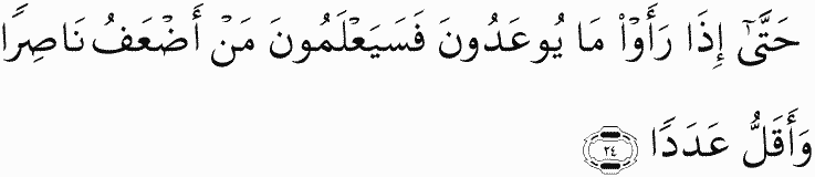 [The disbelievers continue] until, when they see that which they are promised, then they will know who is weaker in helpers and less in number.