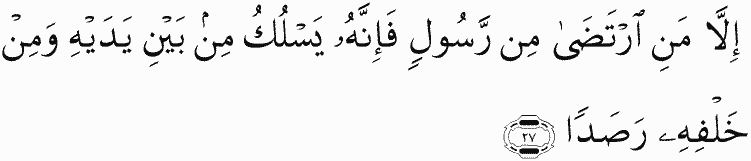 Except whom He has approved of messengers, and indeed, He sends before each messenger and behind him observers