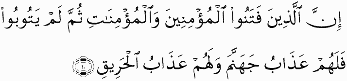 Indeed, those who have tortured the believing men and believing women and then have not repented will have the punishment of Hell, and they will have the punishment of the Burning Fire.