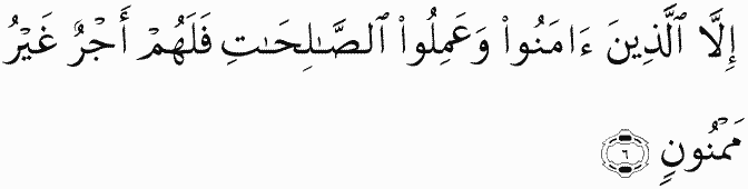 Except for those who believe and do righteous deeds, for they will have a reward uninterrupted.